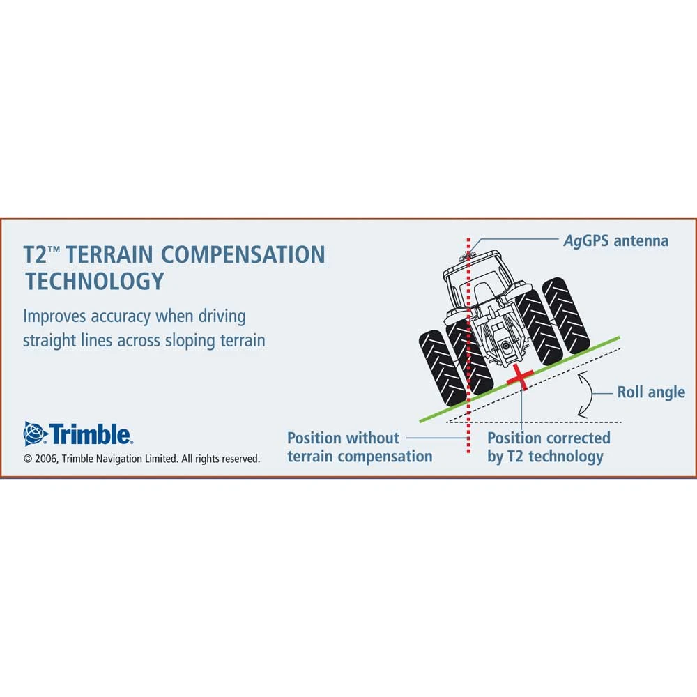 Trimble’s exclusive T2 terrain compensation technology gives the EZ-Steer user +/- 6″-8″ pass-to-pass accuracy and smooth hands-free driving on rolling, sloping or even rough terrains such as ditches, waterways, and terraces. This optional feature uses two accelerometers and two gyroscopes to compensate for roll and yaw. Information from these sensors, located in the steering controller, is used at ten times per second to compensate the GPS position for sloping and rough terrain.