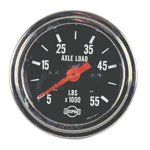 These affordable gauges are designed to convert the air pressure on air suspension transport trucks to pounds for axle load. A 2″ gauge with chrome-bezel can be easily mounted in either the cab or directly on the trailer to give an indication of load weight by using input pressures from the suspension. 0-55 x 1000 axle load.