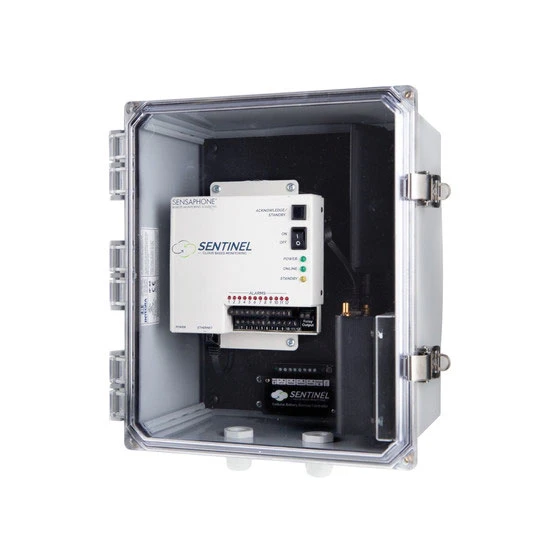 This Sentinel version uses a wired Ethernet connection and your Internet service to connect to the Sensaphone. net cloud. Models are also available in NEMA4X enclosures and with cellular service options.