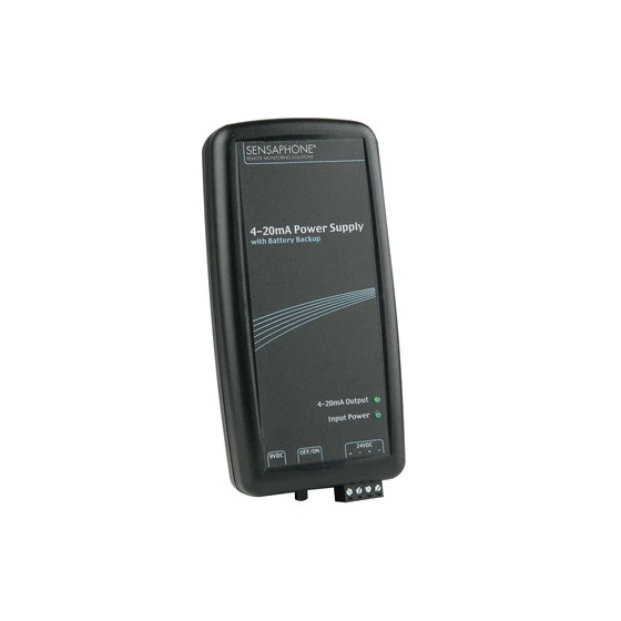 A 24V power supply with built-in battery backup is designed for powering any of the 4-20mA sensors from Sensaphone. The backup battery can provide up to 8 hours of backup power.